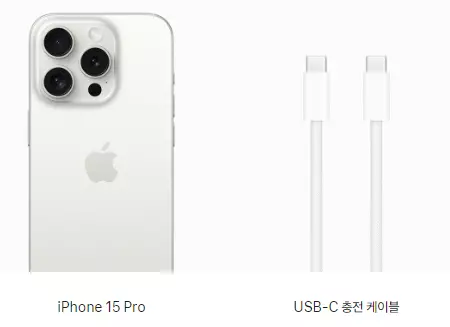 아이폰15 프로를 구매하시면 핸드폰 본체 기기와 USB-C 충전 케이블을 받으실 수 있습니다. 기존과 달리 충전 케이블이 호환성이 높은 USB-C 타입으로 변경된 만큼 케이블도 함께 지원되는 것을 확인하실 수 있습니다.