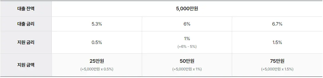 간단히 예를 들어 보면 만약 5,000만 원의 대출을 받았다고 할 때 현재 이용 중인 대출 금리별 지원금은 다음과 같으니 내 상황에 맞춰 적용시켜 보시길 바랍니다.
